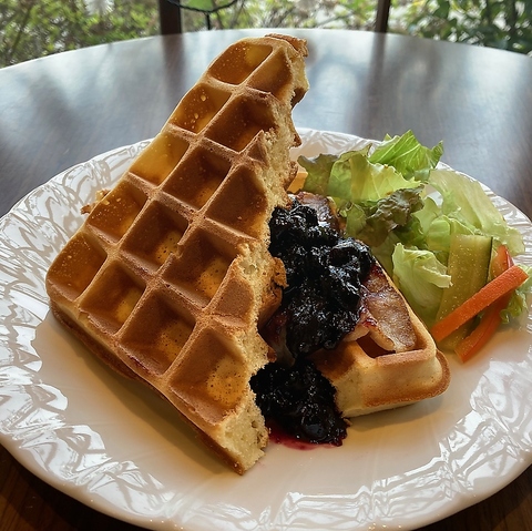 甘酸っぱいブルーベリージャムとジューシーなベーコンを、優しい甘さのワッフルと合わせました。サラダ、ドリンク付きです。