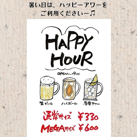 OPEN~19:00までハッピーアワー実施中☆生ビールやハイボールが330円(税込)で楽しめる◎メガサイズもお得!