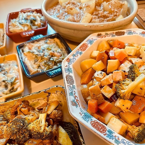 お客様が食べると心から「落ち着く味」を追求し、毎日厨房で心を込めて手作りしています。その日のベストな食材を厳選して仕入れ、素材の魅力を最大限に引き出すよう、ひとつひとつ丁寧に調理。常時10種類以上の彩り豊かなお料理をご用意しております。心も体も満たされる、優しい味わいをご堪能ください。