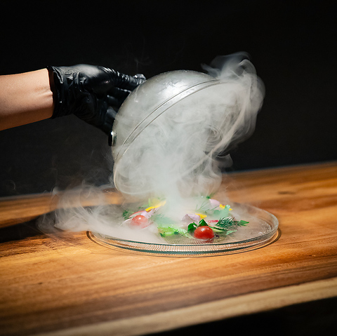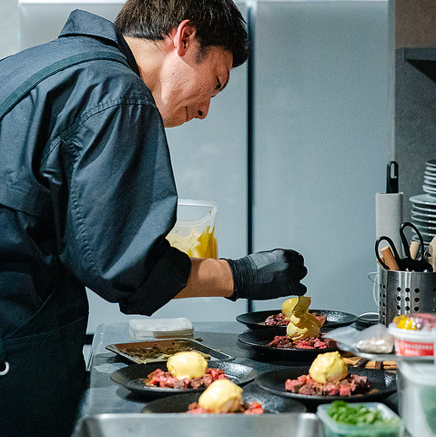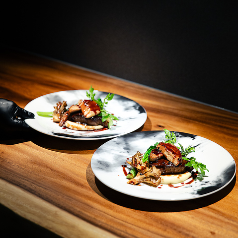 低温調理でしっとり仕上げたローストビーフに、フレンチ王道のウフマヨを合わせました。仕上げにローストガーリックソースでコクと香ばしさを引き立てます。香り、温度、盛り付けまで細部にこだわり、目の前に運ばれた瞬間から物語が始まります。五感で楽しむ特別な食体験がここにあります。