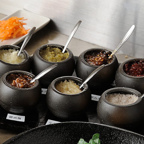 自家製のピリ辛コチュジャンや青唐みそをはじめ、にんにく、柚子胡椒、醤油麹、生姜だれ、藻塩の7種の薬味を添えて、3種類の鍋をお楽しみいただけます。味が濃いめですので、少量ずつお試しください。香味醤油もございますので、お好みでどうぞ。