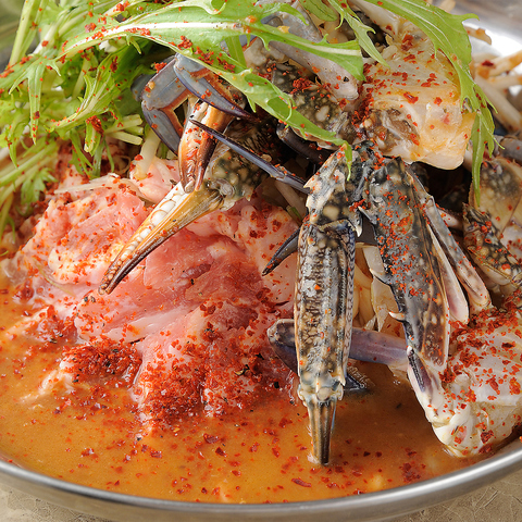 スープにワタリガニの風味豊かな濃厚鶏白湯に特製ダレを合わせた旨辛鍋をお楽しみください。2人前~