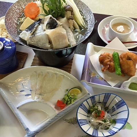 ◇お献立・てっさ・てっぴ・てっちり鍋・ふぐの茶碗蒸し・ふぐの唐揚げ・香の物・ごはん・デザート ※注意/内容:お食事処でのお食事。大浴場も無料でご利用いただけます。タオルはご持参ください。