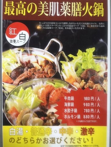 中国で広く親しまれてきた中華五千年文化を象徴する代表的な料理。出汁には18種類以上の漢方を使用し薬膳としての滋養と料理としての美味しさを同時に楽しめます。具材をコンロで煮込みながら味わわうスタイル。天然コラーゲン豊富な滋養スープ「白湯」と体を芯から温める麻辣スープ「紅湯」など全4種から選べ体調や好みに合わせて楽しめます♪