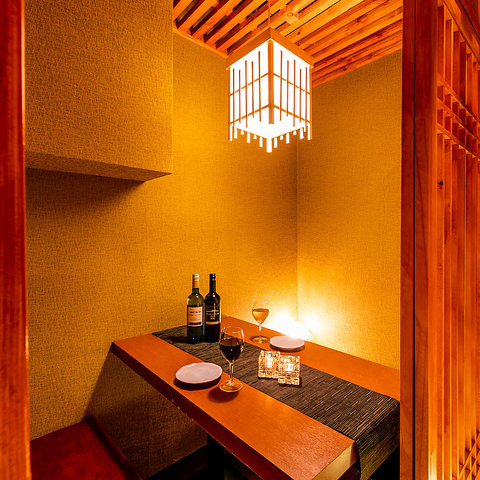2名様~ご利用可能なテーブル個室を多数ご用意しております。デートや記念日に雰囲気のあるプライベート空間です。扉付き個室となっておりますので周りを気にすることなくお過ごし頂けます。お席のみのご予約も大歓迎です。