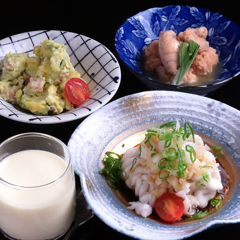 レパートリー豊富な一品料理を多彩にご用意。その日仕入れた新鮮な魚を使った「刺身盛り合わせ」は逸品です!週末やご予約によっては、明石名物の“昼網の魚”をご提供することも。また、本店で人気のオリジナルメニュー「豚カツサラダ」もおすすめ!豚カツ一枚をサラダの上にのせた、ボリュームたっぷりの大満足な一皿です。