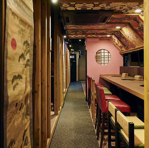 着物の柄を模した壁紙や、店内の桜の木など日本文化を存分に感じる和風な雰囲気が魅力。上野観光にはもちろん、海外の方へのおもてなしにも!”和”に包まれた空間で味わう絶品和牛に、喜ばれること間違いなし!