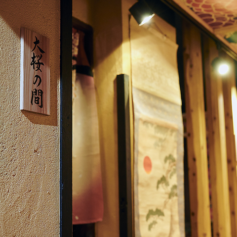 【テーブル席】着物を模した壁紙や、桜の木など、”和”の趣を感じる落ち着いた雰囲気の店内。テーブル席は少人数~団体様まで、幅広いシーンでご利用いただけます。海外ゲストへのおもてなしや接待にも最適です♪