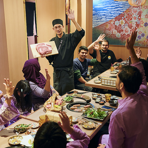 着物の柄を模した壁紙や、店内の桜の木など日本文化を存分に感じる和風な雰囲気が魅力。上野観光にはもちろん、海外の方へのおもてなしにも!”和”に包まれた空間で味わう絶品和牛に、喜ばれること間違いなし!