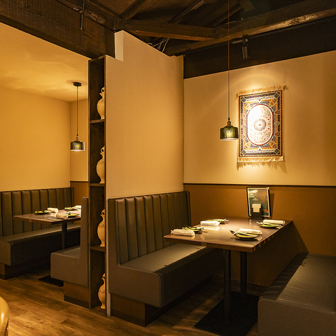 ブラウンを基調とした内装で、落ち着いた雰囲気が漂う心地よい空間ですので、ゆったりとお過ごしいただけます。壁に飾った異国情緒あふれる装飾を見ながら、スパイスが香る美味しいお料理をお楽しみください◎親しいご友人との食事や顔合わせなど、さまざまなシーンに最適です。