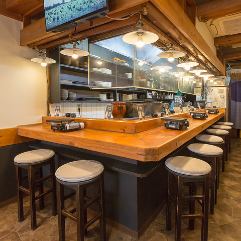 カウンターは8席のみのコンパクトな造りで、ひとり飲みやサクッと食べたい時にぴったり。焼きたての香ばしい音や溶岩石の熱気を近くで感じられ、料理が届く瞬間まで楽しめる特等席です。仕事帰りにも立ち寄りやすく、初めての来店でも利用しやすい雰囲気が魅力。