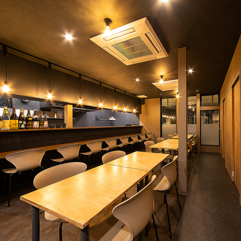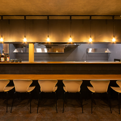 【カウンター】お一人様からご利用いただけるカウンターございます!シンプルかつ落ち着いた雰囲気の中、 目の前で職人が造りあげるライブ感を肌で感じながら、お酒と逸品をお愉しみください。