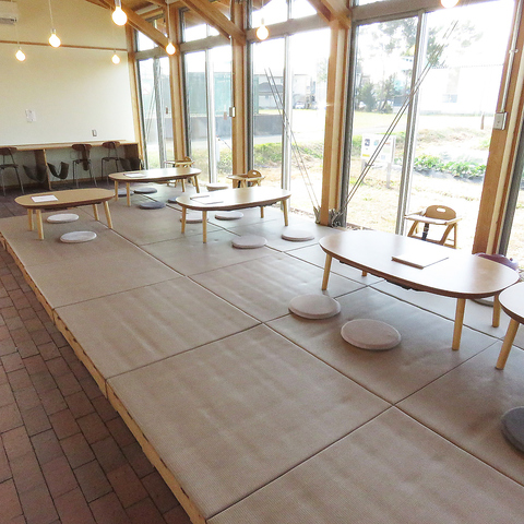 【畑のあるカフェLEAF】お客様の様々なニーズにお応えするため、カウンター席やテーブル席、お座敷など、多様なタイプのお席をご用意しております。さらに、お車でのご来店でも安心の20台以上の広々とした駐車場を完備しておりますので、ぜひお気軽にご利用くださいませ。