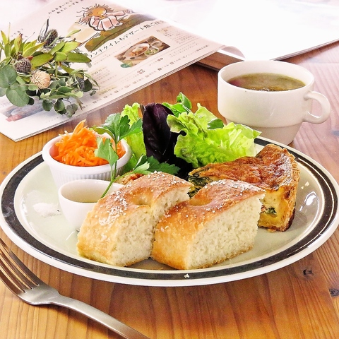 米粉を使ったキッシュは、しっとりとした食感と豊かな風味が特徴で、具材には新鮮な季節野菜をふんだんに使用しています。栄養バランスも考慮し、ヘルシーで満足感のあるプレートに仕上げました。おにぎりまたはフォカッチャ・スープも付いており、ボリューム満点の一皿です!