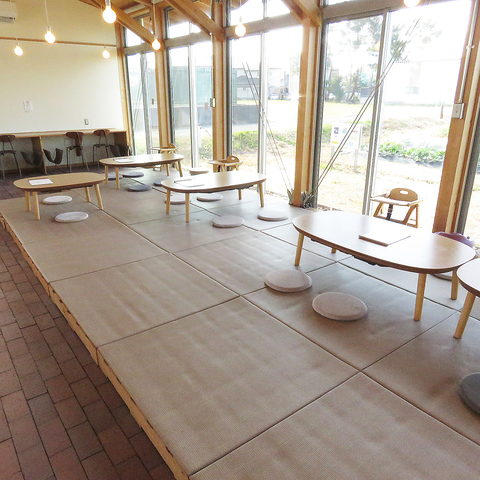 【畑のあるカフェLEAF】お客様の様々なニーズにお応えするため、カウンター席やテーブル席、お座敷など、多様なタイプのお席をご用意しております。さらに、お車でのご来店でも安心の20台以上の広々とした駐車場を完備しておりますので、ぜひお気軽にご利用くださいませ。
