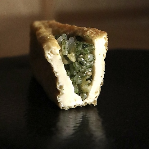 毎日店内で豆腐を揚げて作る「生いなり」も名物!絶妙な揚げ加減で仕上げる、トロっとクリーミ―な食感。この独特な食感を楽しめるのは3時間まで!ぜひご予約ください!