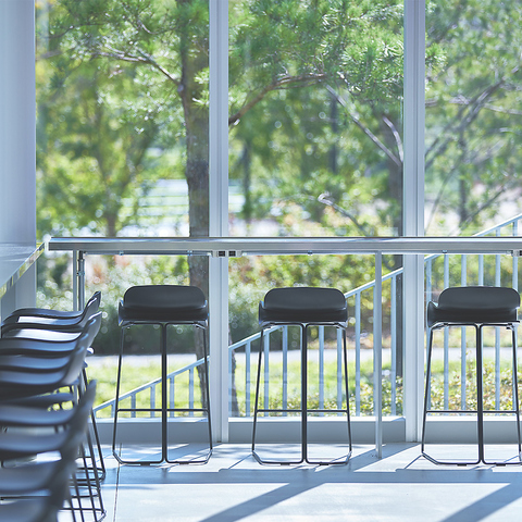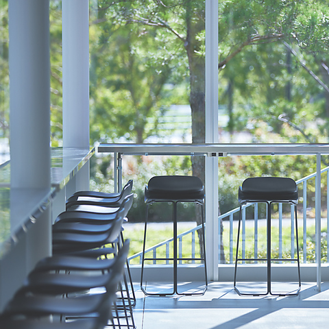光と影、自然との共生を感じる窓際カウンター席。開放感あふれる店内で、目の前に広がる緑を眺めながら、心安らぐカフェタイムをお過ごしいただけます。