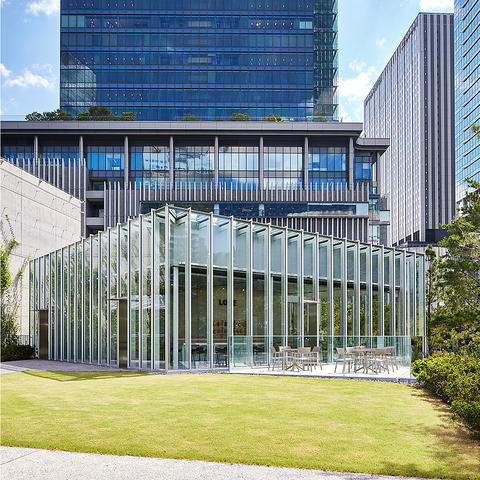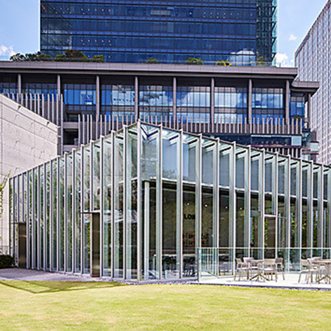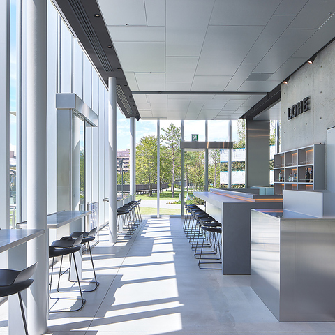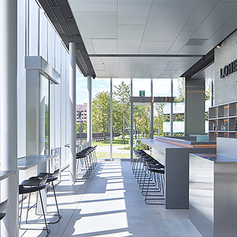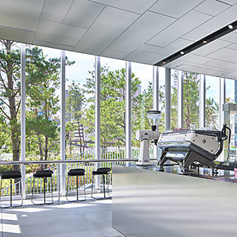 店内はガラス張りで、自然光がたっぷりと差し込む明るく開放的な空間です。光と影、そして自然との共生を大切にした設計により、都心にいることを忘れさせる心安らぐひとときを提供いたします。洗練されたシンプルなデザインの中で、ゆったりとしたカフェタイムをお楽しみください。