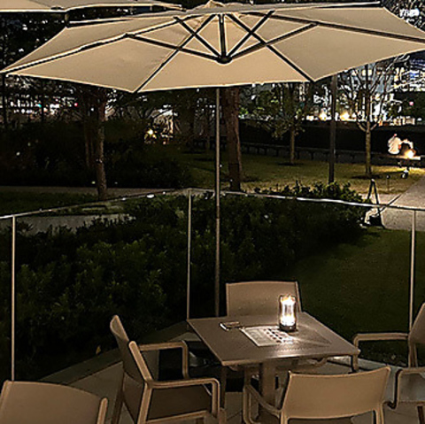夜はムーディーな照明が灯り、幻想的な雰囲気に包まれるテラス席。ライトアップされた公園と遠くに見える街の夜景を眺めながら、特別なコーヒーカクテルで大人な時間をお過ごしください。