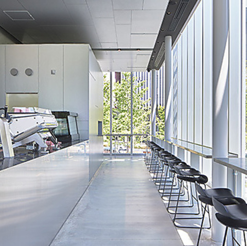 安藤建築のデザイナーによる、シンプルで洗練されたデザインが特徴です。360度ガラス張りの開放感溢れる店内には、カウンター席を完備しております。美味しいコーヒー無機質なコンクリートと緑の調和。非日常的な美しさの中で、特別な時間をお過ごしください。
