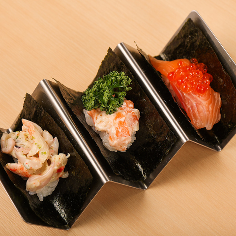 手巻き寿司の常識を覆す、進化系スタイルの寿司ドッグが登場しました◎ネタをシャリで包み込んで食べる、見た目も楽しい一品です♪定番人気のマグロから、お子様に大人気のマヨコーンまで、バリエーション豊富なネタをご用意しております。ご家族やご友人と、ワイワイ楽しみながらお気に入りの味を見つけてみてください。