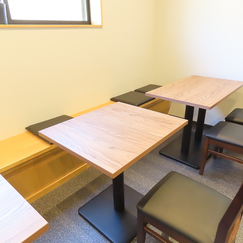 ゆったりとお食事を楽しみたい方のために、広々としたテーブル席をご用意しております。4名様掛けのテーブルが3卓、2名様掛けのテーブルが1卓あり、ご家族でのお食事や友人との集まりにも最適です。落ち着いた雰囲気の中で、美味しい料理を囲めば会話も弾みます。少人数の宴会などご希望の際はお気軽にご相談ください。