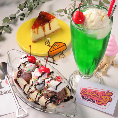 自家製チーズケーキはクリームチーズをたっぷり使い、しっとり濃厚な味わいが魅力♪表面をパリパリのブリュレに仕上げるオプションも追加料金なしで楽しめます♪ さらに、アメリカの定番スイーツ・バナナスプリットも人気で、甘さとボリュームが絶妙にマッチ。カフェタイムに絶品スイーツで特別な時間をお過ごしください!