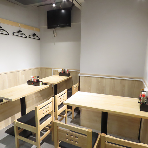木目を基調とした明るく清潔感のあるテーブル席。席同士の距離はやや近めで、店内の賑わいを感じながら食事を楽しめる空間です。友人同士のカジュアルな飲み会や、気取らずリラックスしたプライベート利用におすすめ。本格手作り餃子や焼売を囲んで、会話も自然と弾みます。