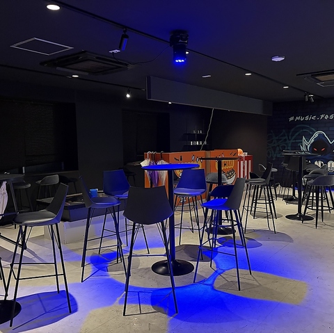 ブルーの照明がフェスのような雰囲気を演出するフロア席。広々としたライブ感溢れる空間は、最大50名様まで貸し切りでご利用いただくことも可能です!スタンディングまたはハイスツール席で、音楽とダーツを同時に楽しめます♪