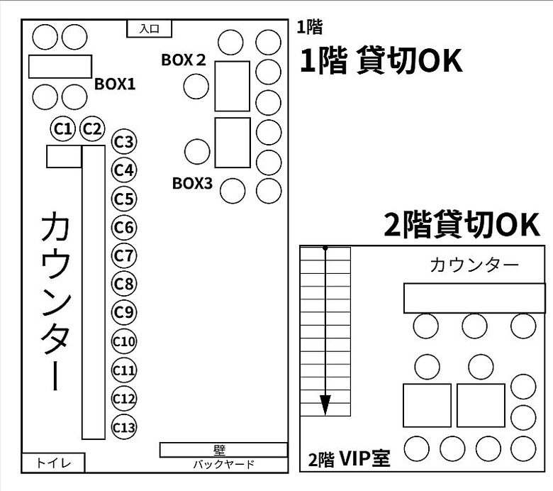 | 総席数 | 38席(1階 BOX14席 カウンター13席 2階 BOX席8席 カウンター3席) |