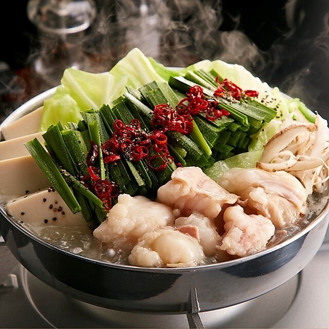 蟻月の代名詞とも言えるもつ鍋は、脂がたっぷり乗った厳選の「国産牛小腸」のみを使用しております。お味は、数種類の白味噌をブレンドした自慢の「白」をはじめ、「赤」、「金」など全6種類をご用意。多彩な味わいを気分に合わせてお選びいただけるのが魅力です。〆には濃厚なスープが絡むちゃんぽん麺がおすすめ。