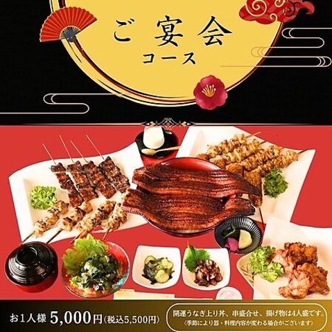 今年の締めくくりを贅沢に!国産のニホンウナギの蒲焼き(丸々2本)をメインに据えた、豪華なご宴会コースです。揚げ物、一品料理、サラダ、串盛り合わせなど多彩な料理を心ゆくまでご堪能いただけます。4名様より承ります。+2,000円(税込)で2時間飲み放題プランを追加可能!忘年会や各種お集まりにぜひご利用ください。