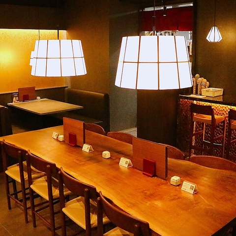 間接照明が柔らかく照らす落ち着いたボックス席で、ゆったりと食事を楽しめる和モダン空間。木の温もりを感じるインテリアと程よいプライベート感が、会食からご友人同士のお食事まで幅広く心地よい時間を演出します。