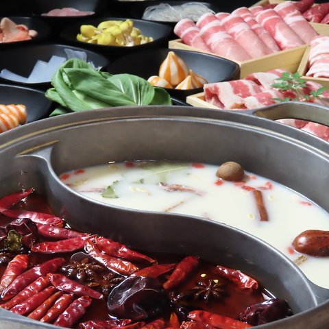 【話題沸騰の、日本式麻辣湯火鍋コース】しゃぶしゃぶ屋が送る日本式麻辣湯火鍋の食べ放題コース。マーラータン火鍋/トマト火鍋/薬膳白湯/酸辣湯の中から2種のスープをお選びいただけます。※ドリンク別