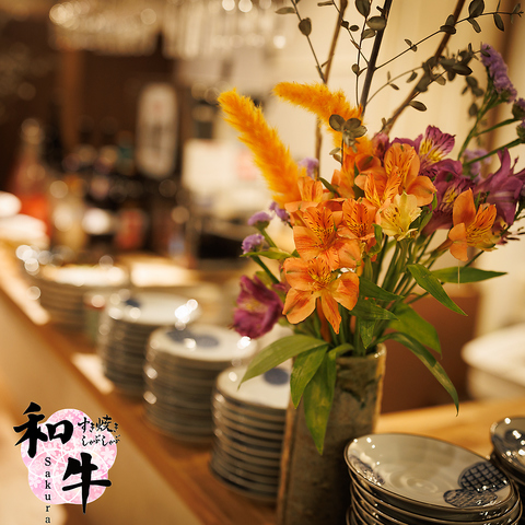 当店では厳選した国産黒毛和牛の上質な部分のみを使用してご提供させていただいております。すき焼き・しゃぶしゃぶの2つをお愉しみいただける各種コースをご用意しております。満開の桜で彩られた特別感溢れる雰囲気抜群な店内で大切な方との特別な時間をお過ごしください。名駅での企業宴会・忘年会・新年会・接待などにおすすめです。