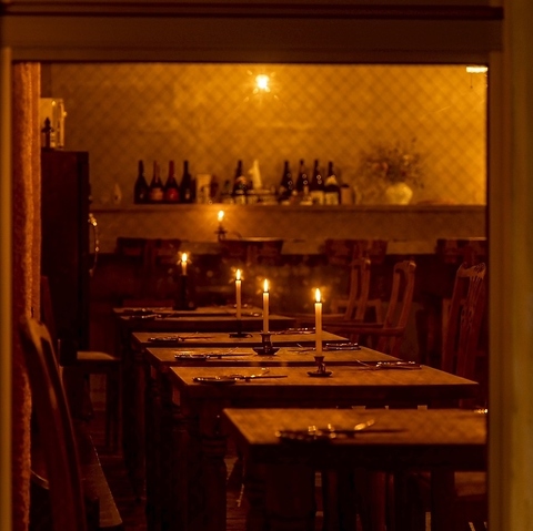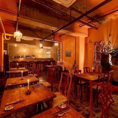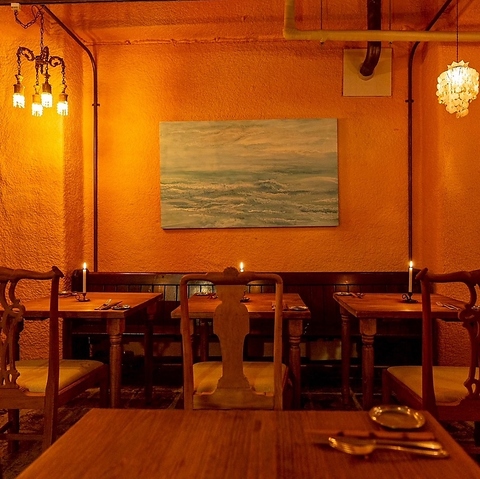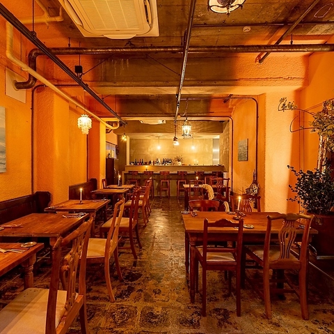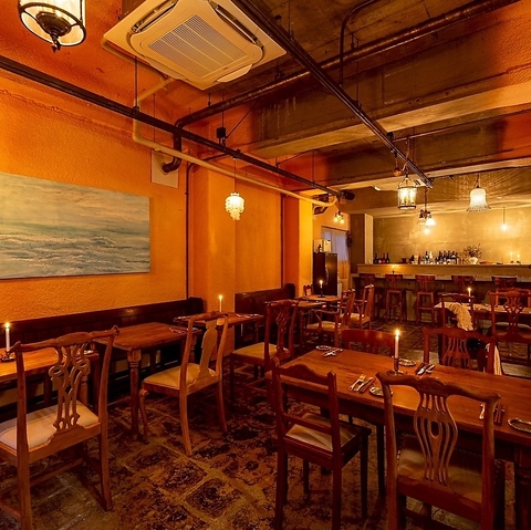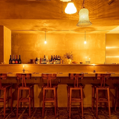 店内に一歩入ると、デザインの異なるお洒落なシャンデリアやペンダントライトが目を引きます♪柔らかなオレンジ色の光がテーブルを優しく照らし、お料理をより一層美しく引き立ててくれます!奥にはバーカウンターもあり、お一人様で静かに過ごしたい時や、デートの締めくくりにも最適◎
