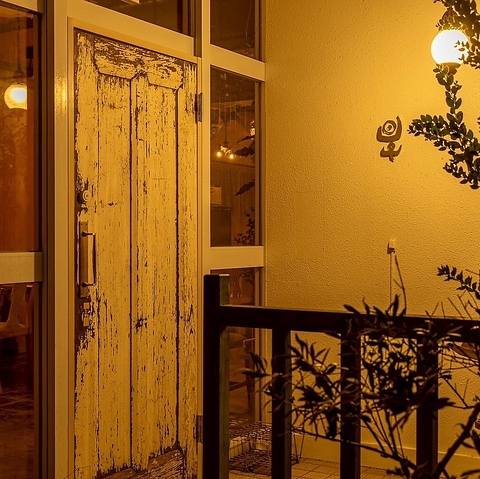アンティーク調の白い木製扉が目印の入口は、隠れ家のようなワクワク感を演出してくれます♪一歩足を踏み入れると、温かみのある照明に照らされた落ち着いた空間が広がります◎コンクリート打ち放しの壁と木の温もりが調和したモダンな内装は、日常を忘れてゆったりと過ごすのにぴったり♪