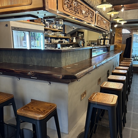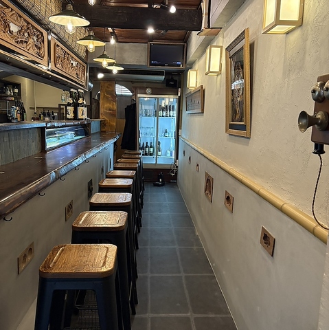 店内はカウンターとテラスには立ち席あり!昭和のレトロな雰囲気を感じる落ち着いたどこか懐かしいお店です