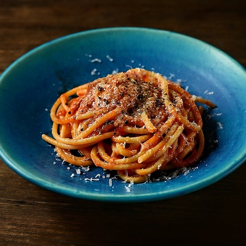 ブカティーニと沖縄食材スーチカーを組み合わせた、ローマ伝統アマトリチャーナ。豚の旨味とトマトのコクが絶妙に溶け合い、心地よい塩気が後を引く一皿です。沖縄とローマの魅力を一度に味わえる人気の逸品です。