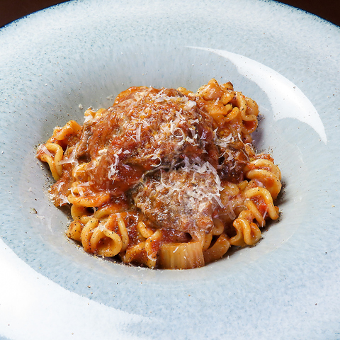 和牛のテールを赤ワインとトマト、香味野菜で煮込んだショートパスタ