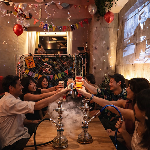 女子会、誕生日会、パーティーなどでご利用頂けます。飲み放題90分付き。※4名様以上から、ご予約承ります。※シーシャ1台+2200円で承ります。