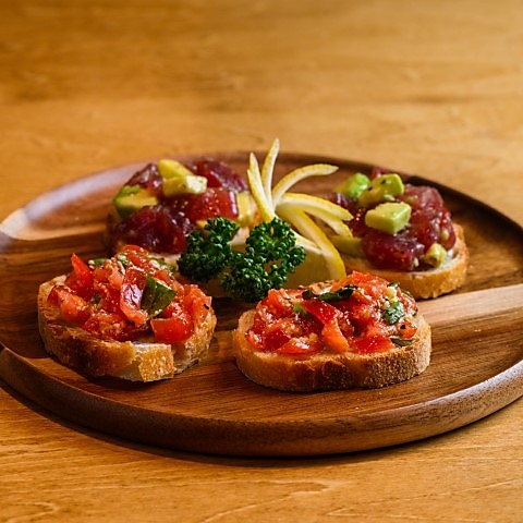 冷凍を一度もしていない新鮮なマグロとアボガドをオリーブオイルで和えました。バジルの香りかおるフレッシュトマトは粉チーズがアクセント。WINEや日本酒によく合う、女性人気ナンバーワンの絶品です。一度ご賞味ください。