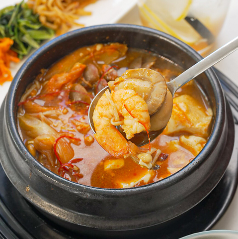 グツグツ煮えた熱々のスンドゥブをお届け!寒い日にぴったりの体の芯から温まる旨辛鍋です。ご飯、ナムル付き。友人とのカジュアルなランチや気分転換に最適です◎