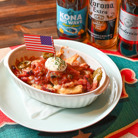 カリッと揚げたフライドポテトに、チーズ・ベーコン・ソースを豪快にオン。アメリカ気分をかぶりつけ!背徳感満載のアメリカンソウルフード!