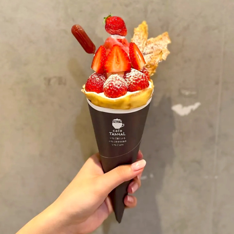 大名店は路面店という立地を活かし、テイクアウトにも最適なクレープをご用意しています。片手で手軽に楽しめるよう工夫されたクレープの中には、もちろん新鮮な完熟あまおうがたっぷり。可愛らしい見た目と濃厚な味わいは、食べ歩きをさらに楽しくしてくれます。お買い物や散策の合間に、ぜひいちごの風味豊かなクレープをお試しください♪