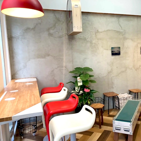 木目調の床とカラフルな色んなデザインのチェアが可愛いテーブル席を多数完備。友人とのモーニングやご家族でのランチなど、幅広いシーンでご利用いただけます。グリーンの植物に癒される明るい空間で、ゆっくりとお食事をお楽しみください。