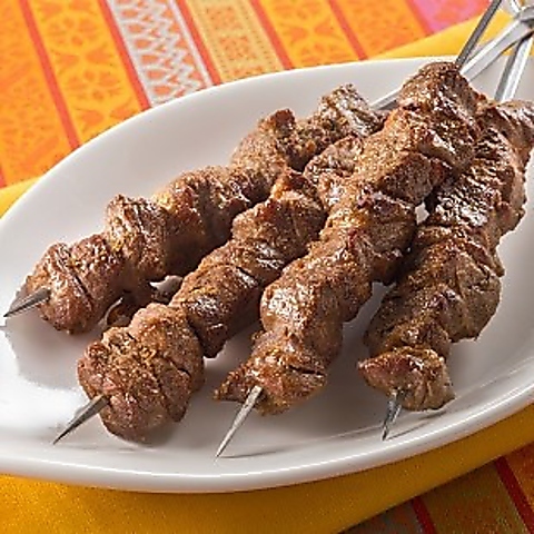 香辛料で味付けした羊肉の串焼き。ヨーグルトのデッピングソースを付けて召し上がれ。