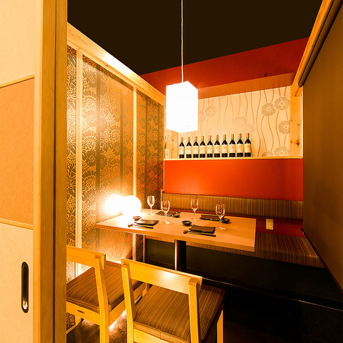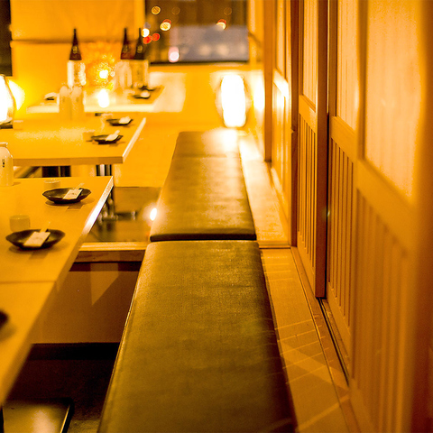 店内は落ち着いた和の雰囲気が漂い、扉付きの完全個室を中心に構成されています。周りの声が気にならないため、会食やデート、ゆっくり語りたい飲み会まで、幅広いシーンで安心して利用できるつくりです。照明はほどよく柔らかく、食事を邪魔しない落ち着いた明るさに調整。