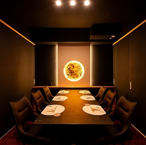 シックで落ち着いた完全個室(6名様用)。大切なゲストをお迎えする接待や、ご家族との心温まる会食にふさわしい上質な空間です。贅沢な静けさの中で、心ゆくまで至高の料理と会話をお愉しみください。