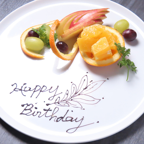 メッセージ付きプレートは2000円~フルーツまたはお肉からお選びいただけます!大切な記念日などにぜひ♪